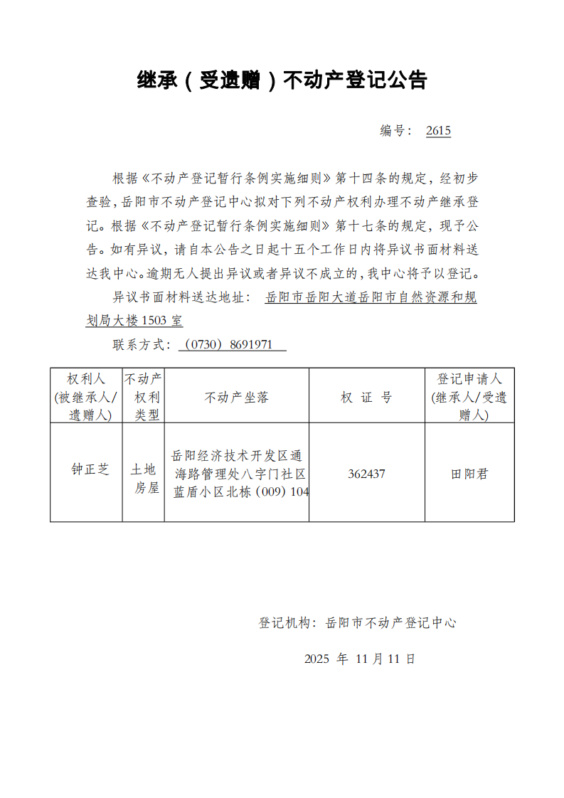 继承(受遗赠)不动产登记公告 编号:田阳君(2615)