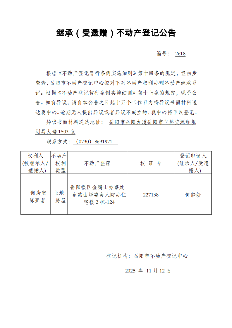 继承(受遗赠)不动产登记公告 编号:何静妍(2618)