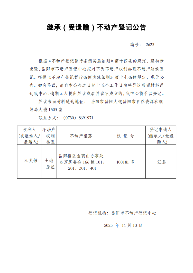继承(受遗赠)不动产登记公告 编号: 汪晨(2623)