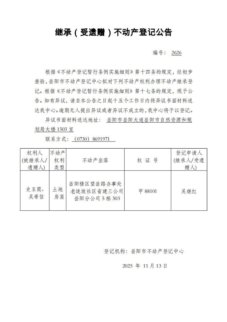 继承(受遗赠)不动产登记公告 编号:吴继红(2626)
