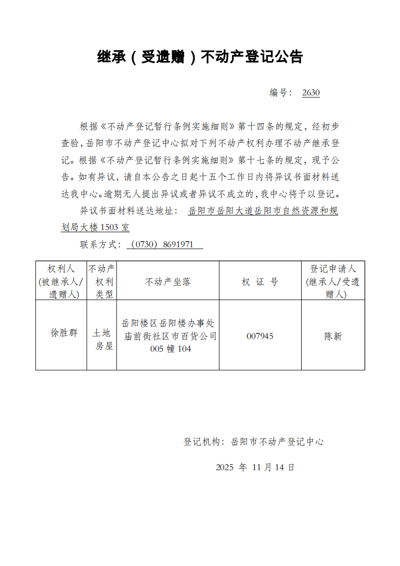 继承(受遗赠)不动产登记公告 编号:陈新(2630)