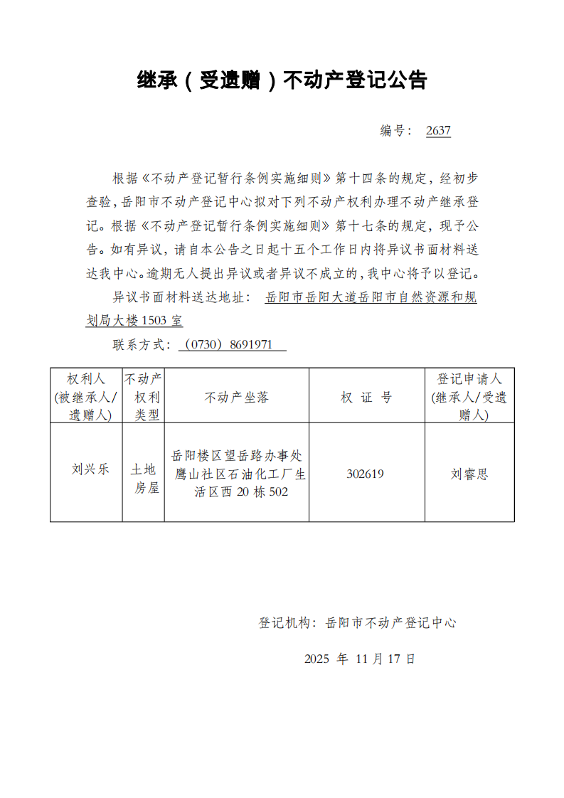 继承(受遗赠)不动产登记公告 编号:刘睿思(2637)
