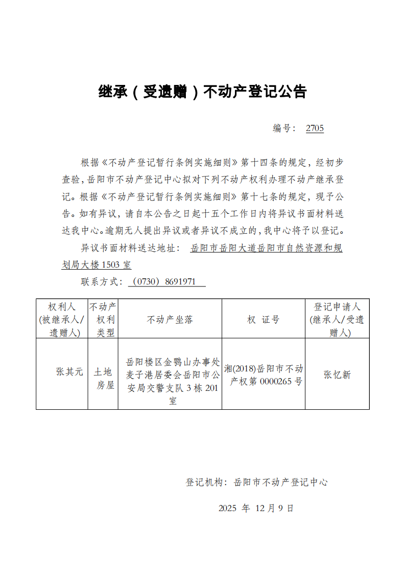 继承(受遗赠)不动产登记公告 编号:张忆新(2705)