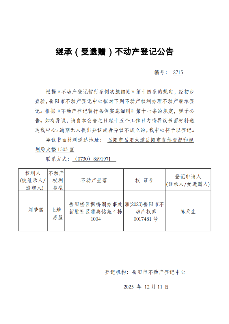 继承(受遗赠)不动产登记公告 编号:陈天生(2715)