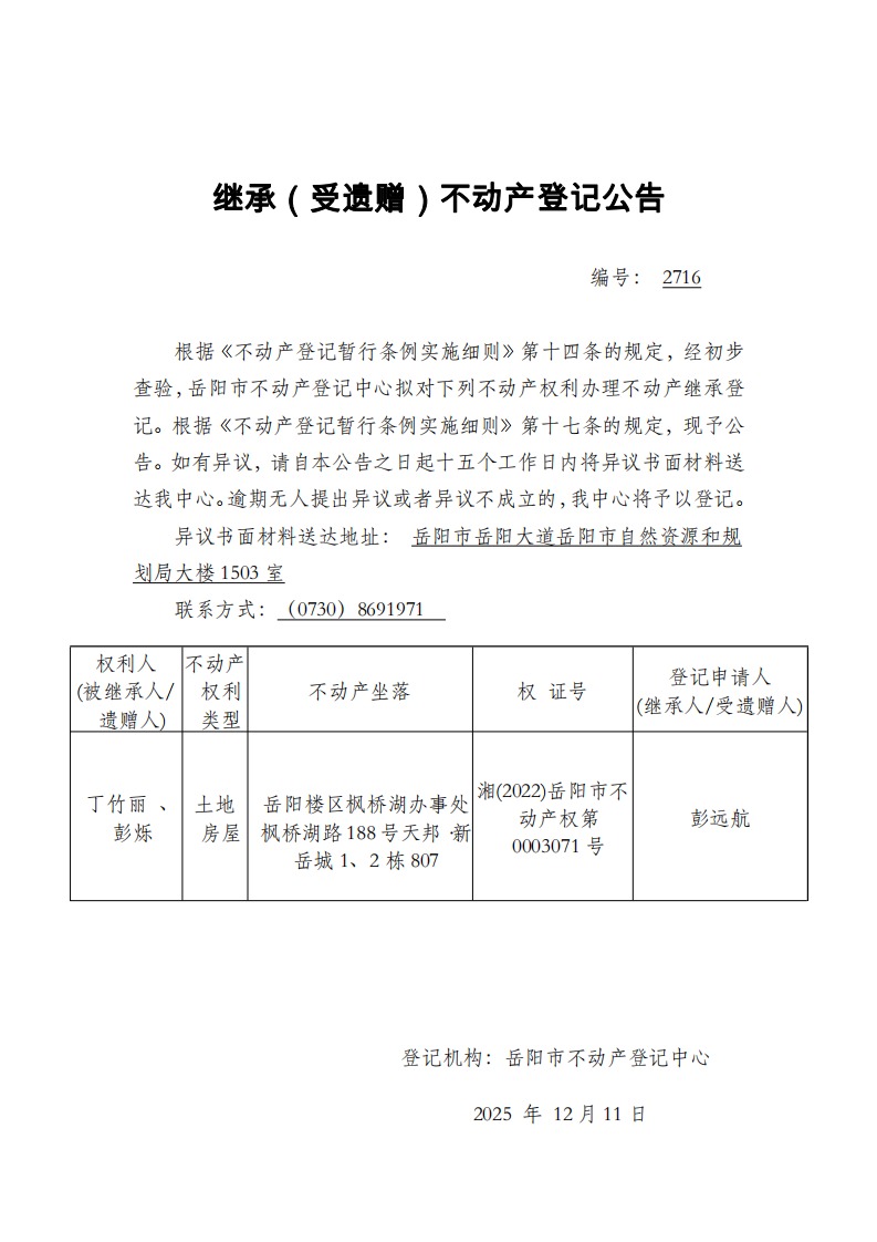 继承(受遗赠)不动产登记公告 编号:彭远航(2716)