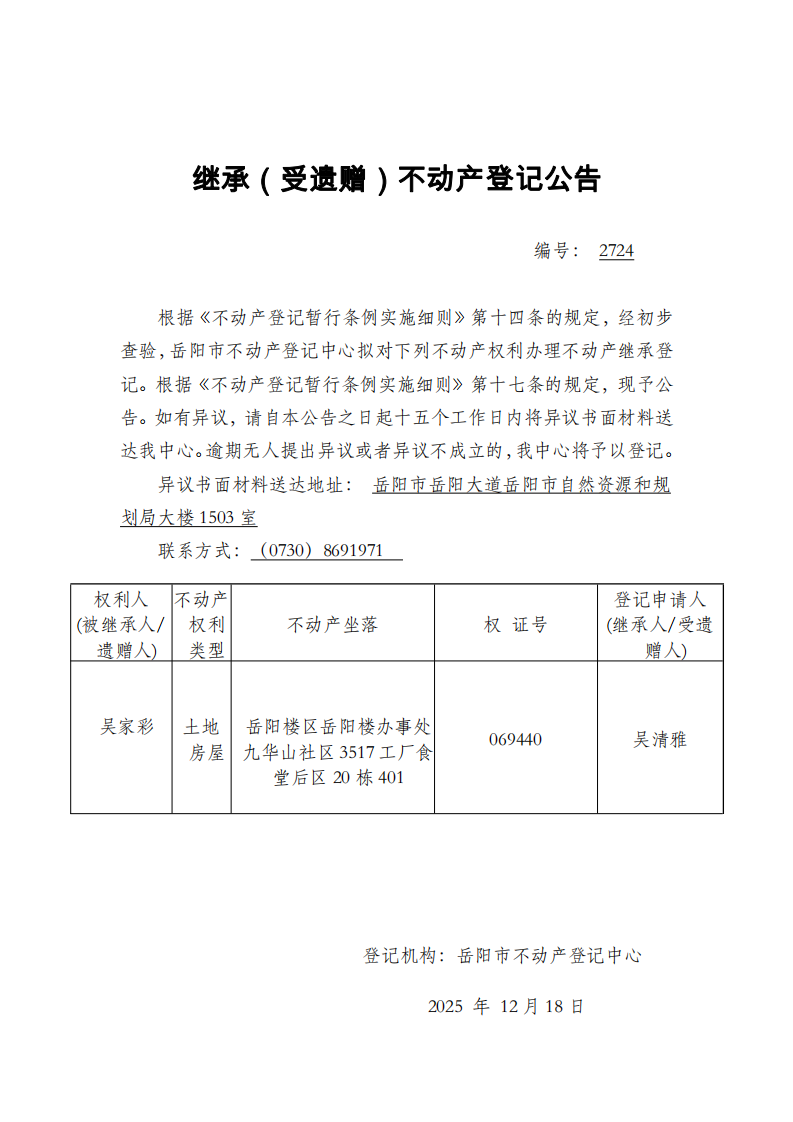 继承(受遗赠)不动产登记公告 编号:吴清雅(2724)