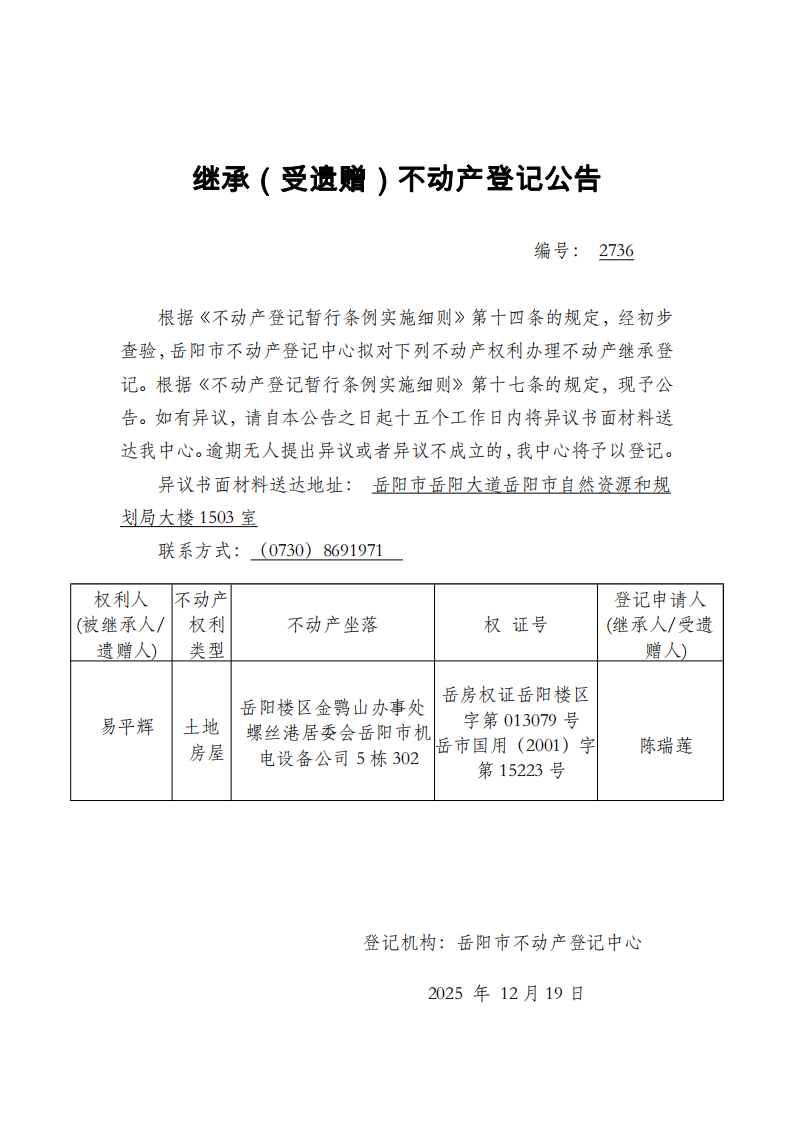 继承(受遗赠)不动产登记公告 编号:陈瑞莲(2736)
