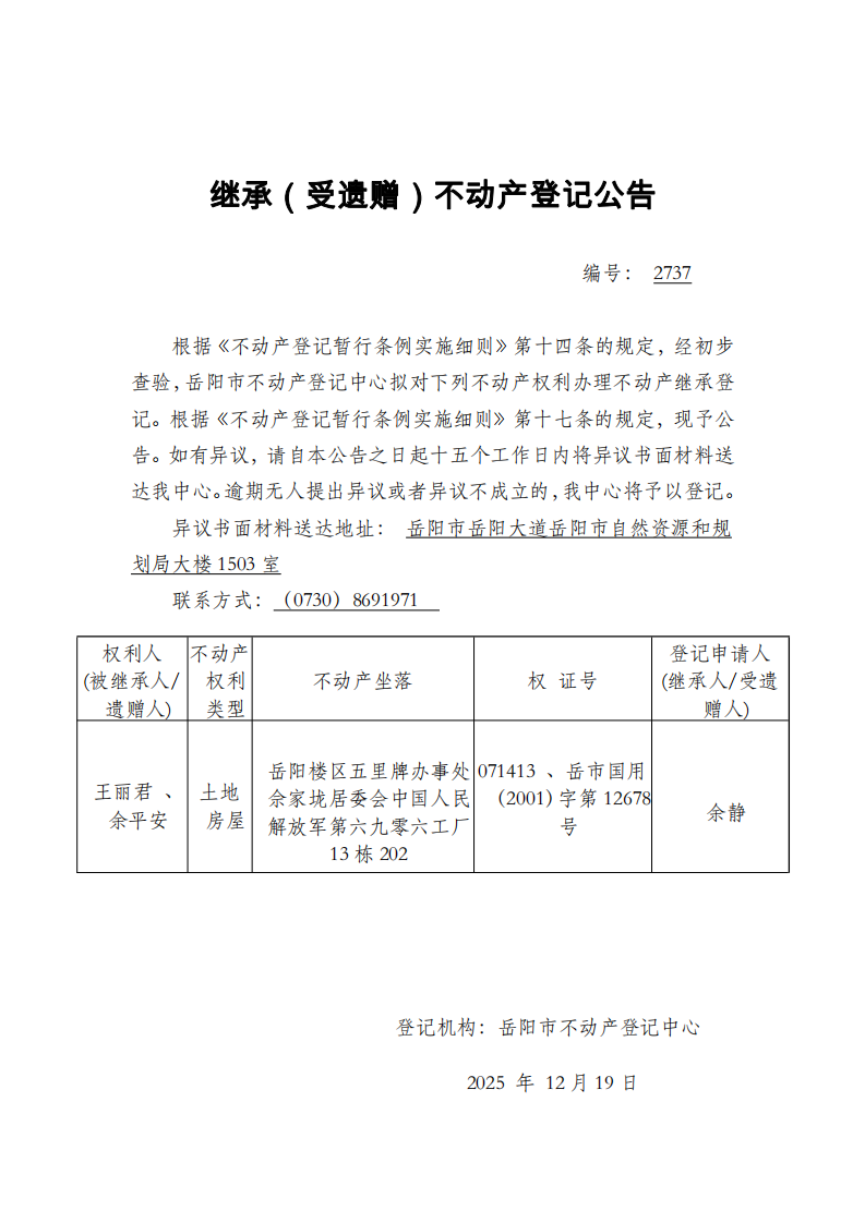 继承(受遗赠)不动产登记公告 编号:余静(2737)
