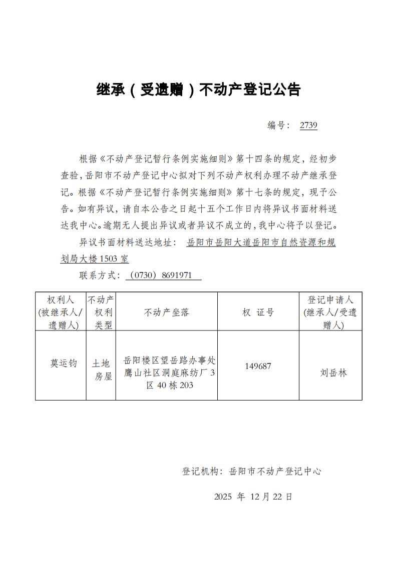 继承(受遗赠)不动产登记公告 编号:刘岳林(2739)