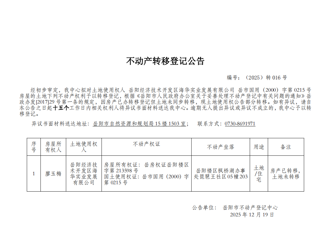 不动产转移登记公告 编号:岳阳经济技术开发区海华实业发展有限公司(2025)转016