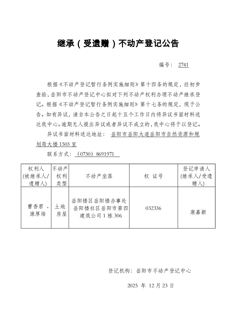 继承(受遗赠)不动产登记公告 编号:康嘉新(2741)