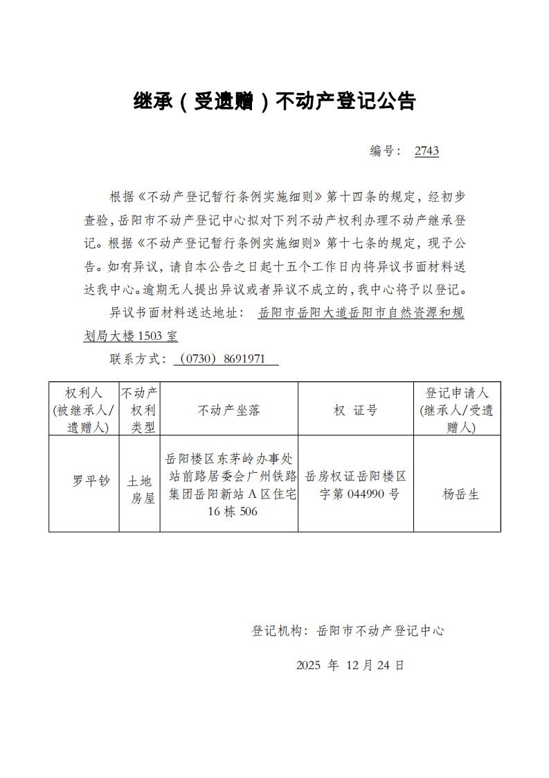 继承(受遗赠)不动产登记公告 编号:杨岳生(2743)