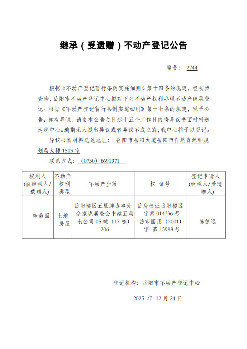 继承(受遗赠)不动产登记公告 编号:陈德远(2744)