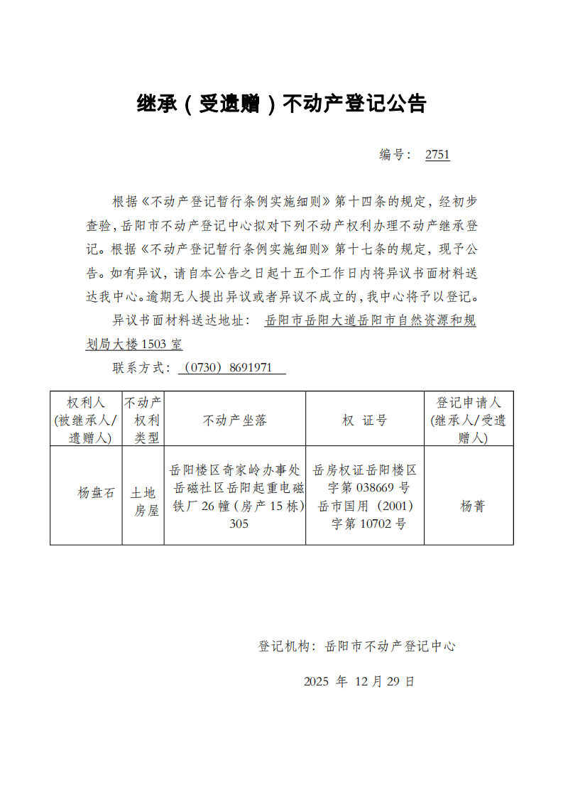 继承(受遗赠)不动产登记公告 编号:杨菁(2751)