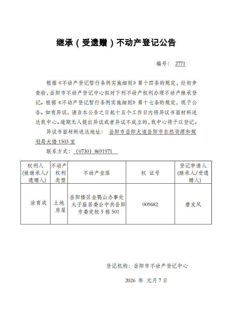继承(受遗赠)不动产登记公告 编号:唐友凤(2771)