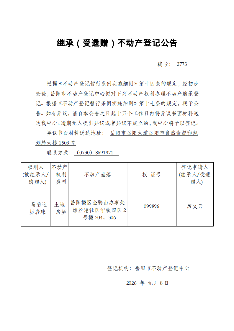 继承(受遗赠)不动产登记公告 编号:厉文云(2773)