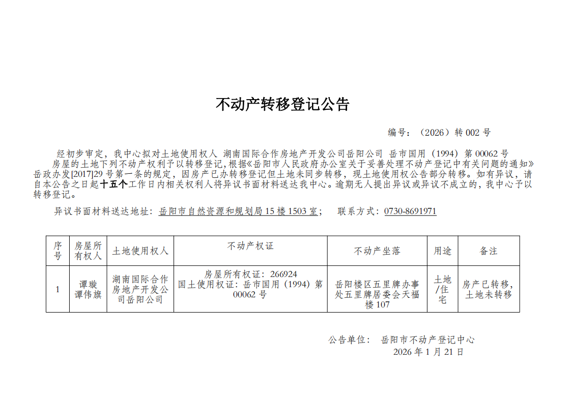 不动产转移登记公告 编号:湖南国际合作房地产开发公司岳阳公司(2026)转002