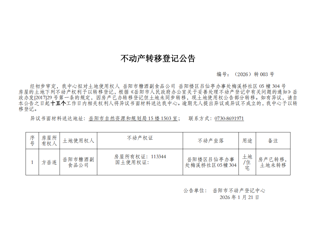 不动产转移登记公告 编号:岳阳市糖酒副食品公司(2026)转003