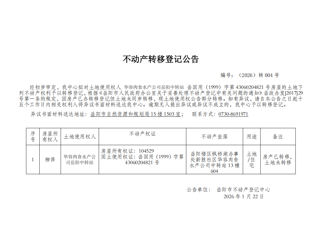 不动产转移登记公告 编号:华容肉食水产公司岳阳中转站(2026)转004