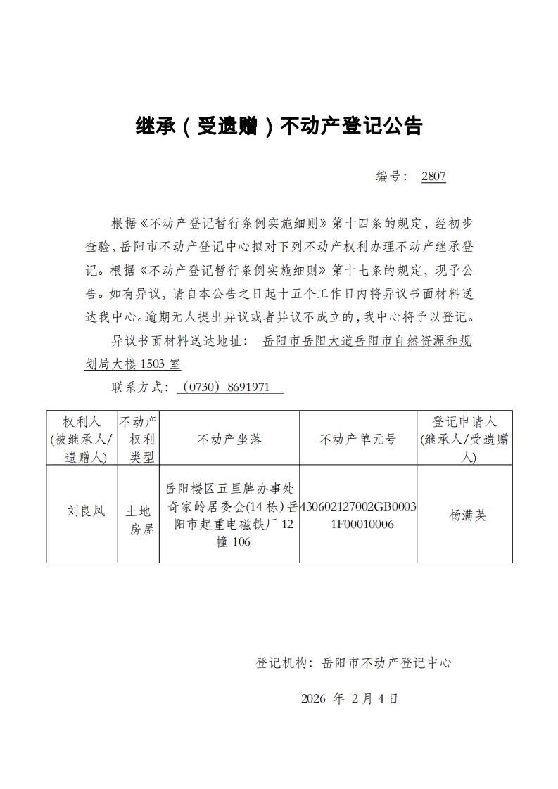 继承(受遗赠)不动产登记公告 编号:杨满英(2807)