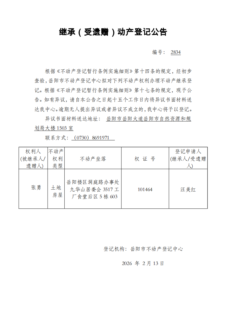 继承(受遗赠)不动产登记公告 编号:汪美红(2834)