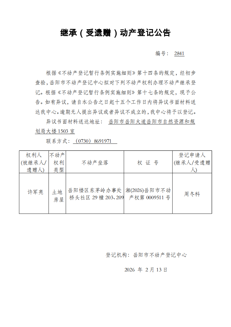 继承(受遗赠)不动产登记公告 编号:周冬科(2841)