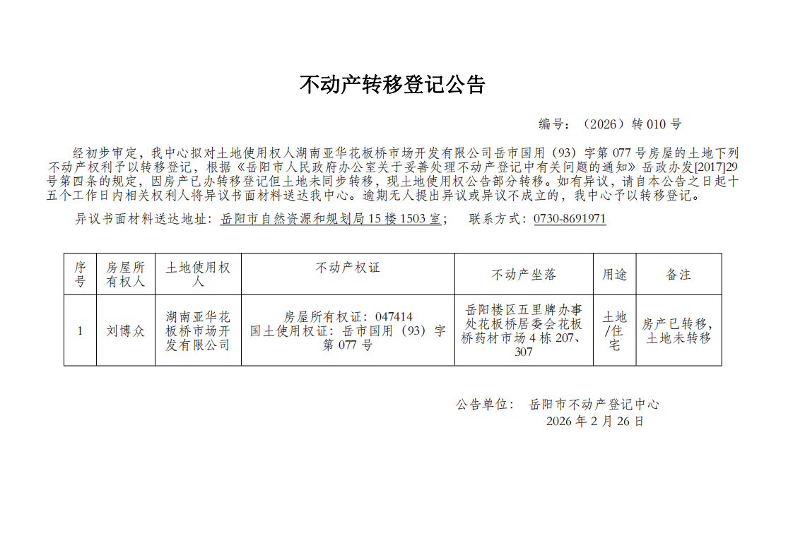 不动产转移登记公告 编号:湖南亚华花板桥市场开发有限公司(2026)转010号