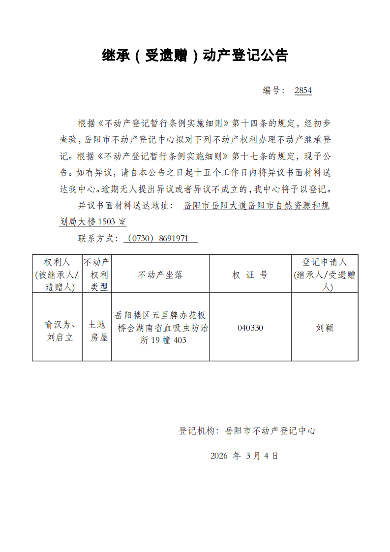 继承(受遗赠)不动产登记公告 编号:刘颖(2854)