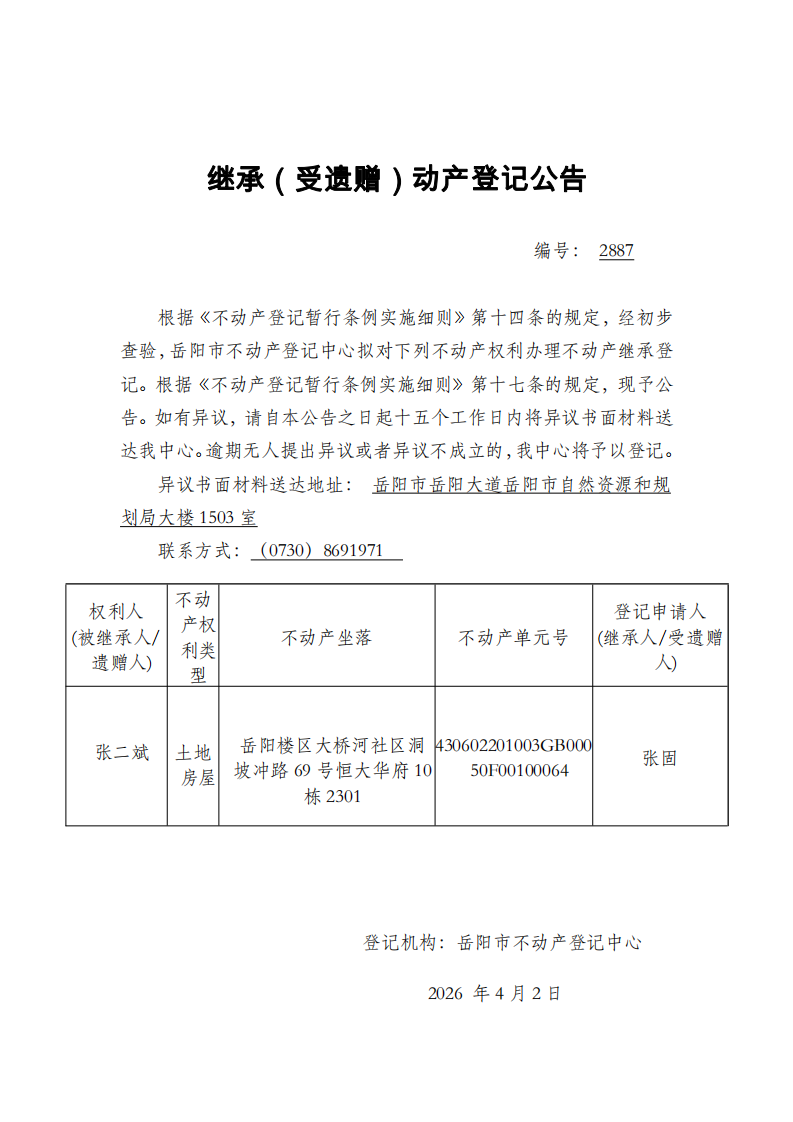 继承(受遗赠)不动产登记公告 编号:张固(2887)