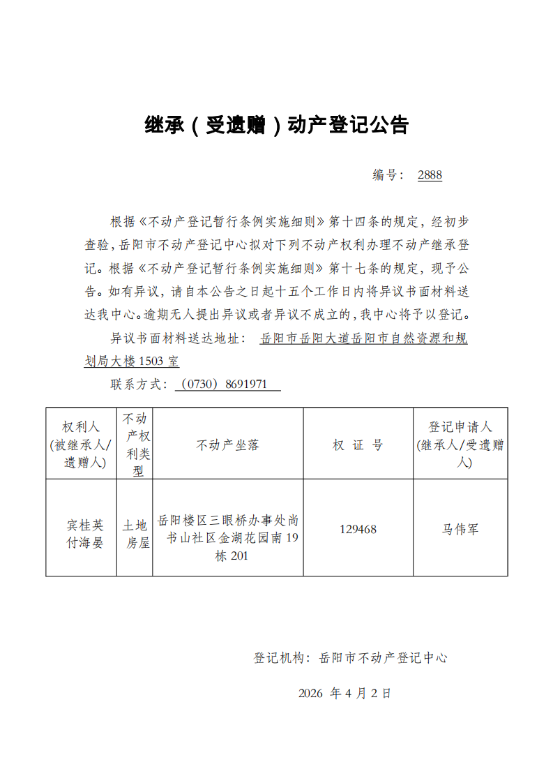 继承(受遗赠)不动产登记公告 编号:马伟军(2888)