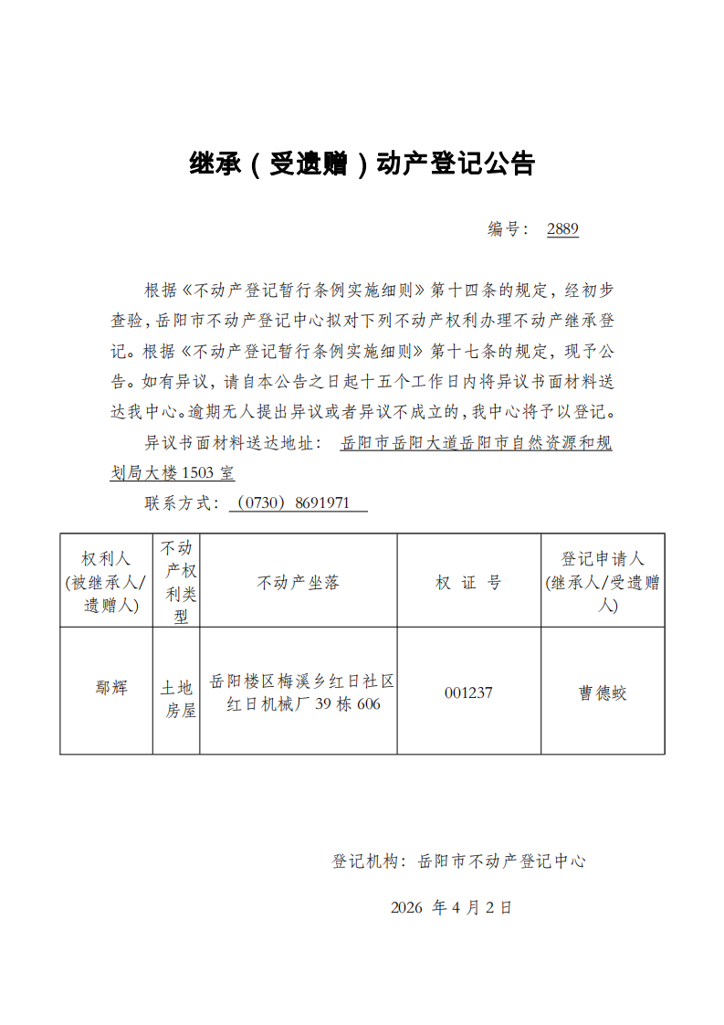 继承(受遗赠)不动产登记公告 编号:曹德蛟(2889)