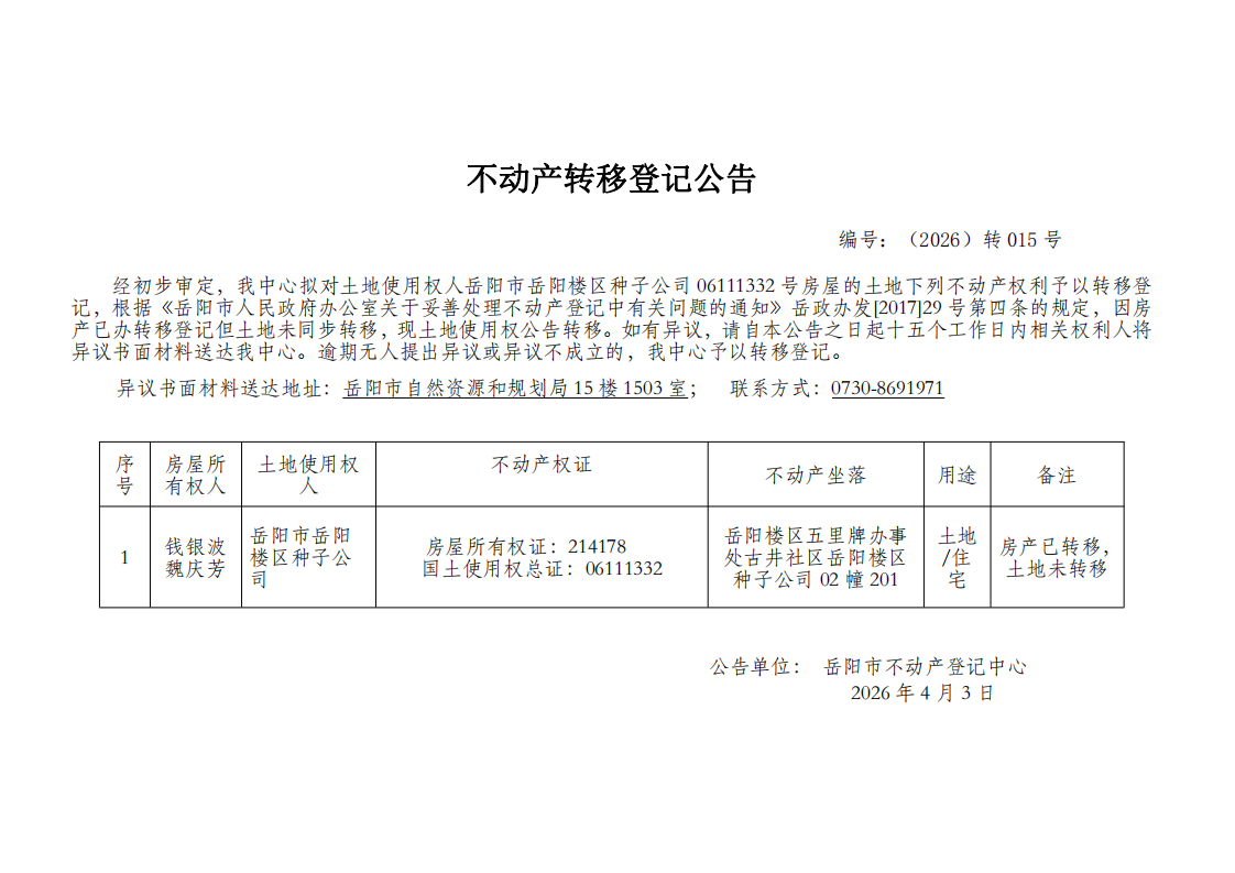 不动产转移登记公告 编号:岳阳市岳阳楼区种子公司(2026)转015号