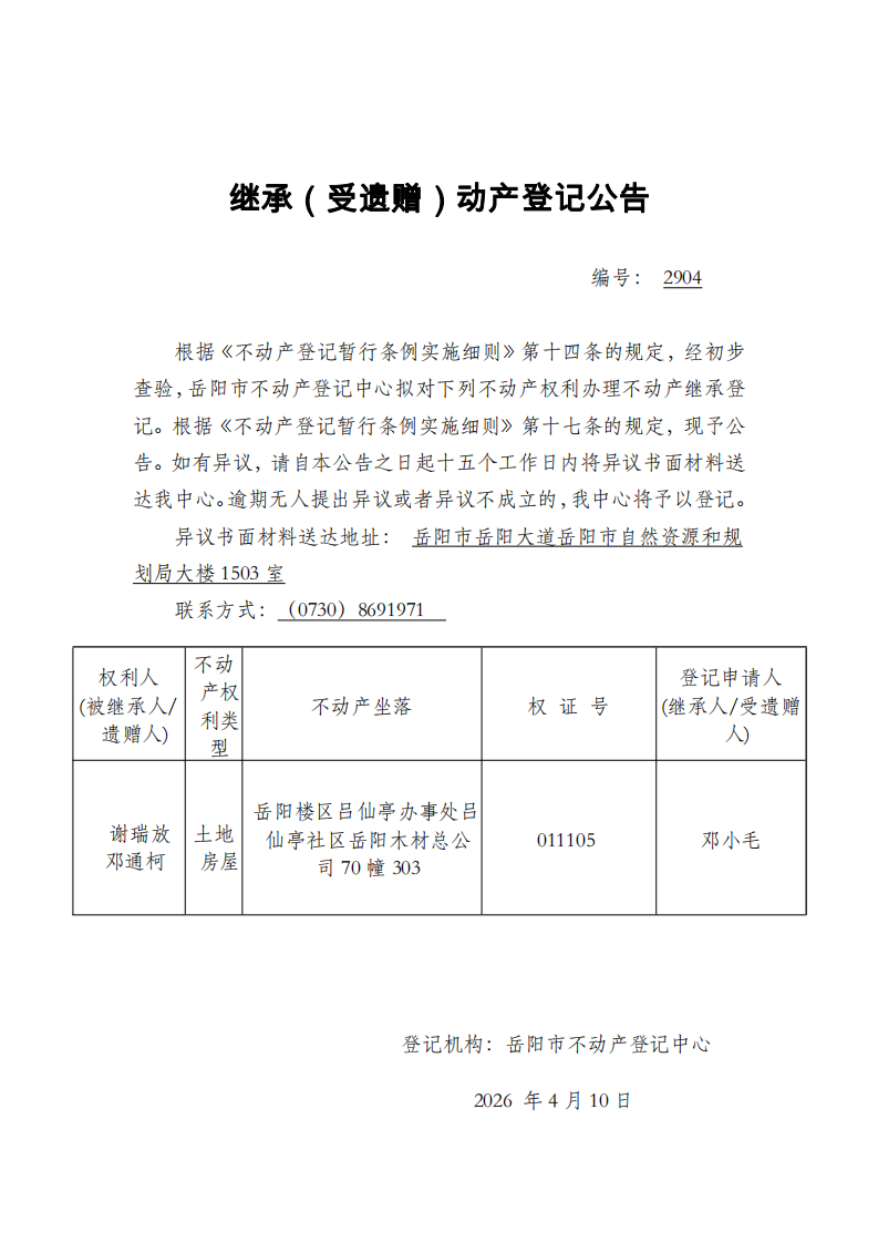 继承(受遗赠)不动产登记公告 编号:邓小毛(2904)