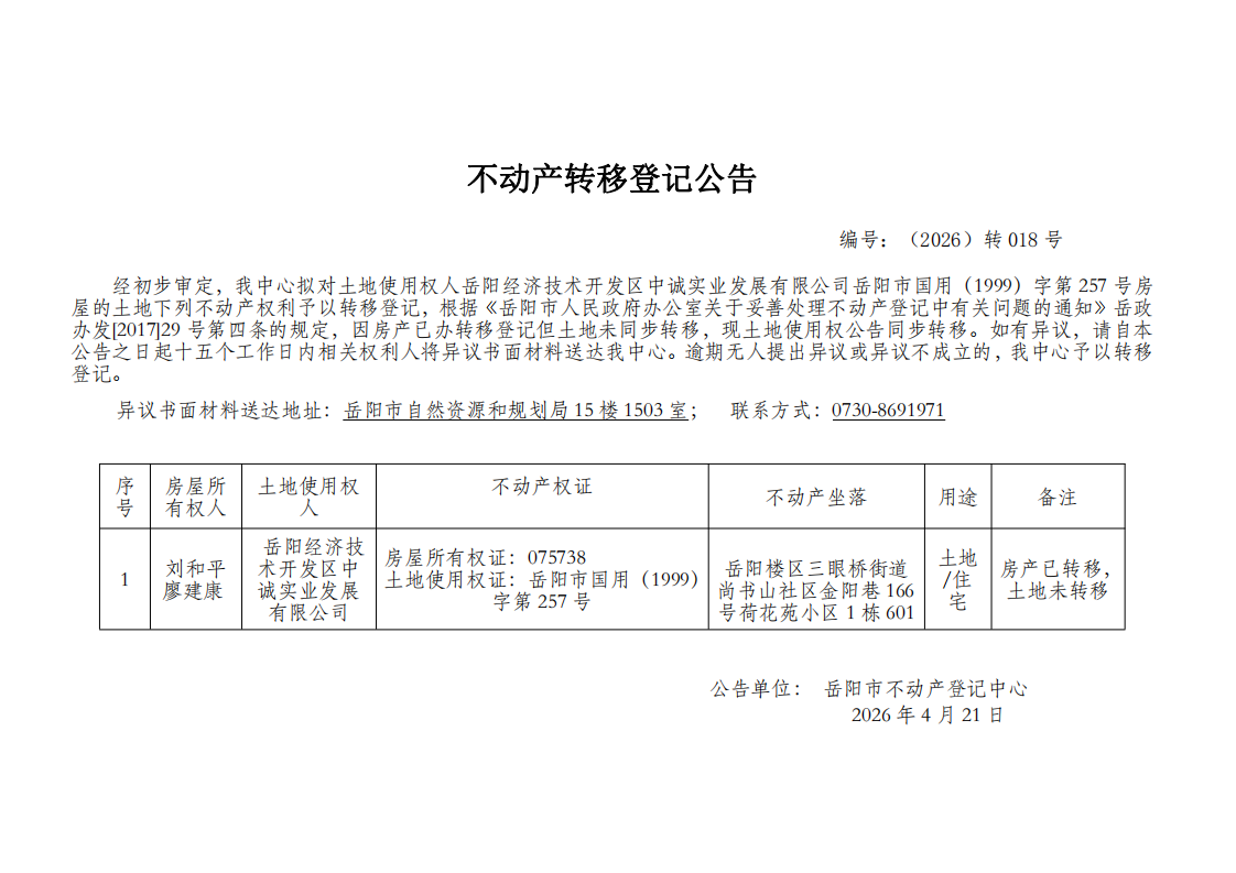 不动产转移登记公告 编号:岳阳经济技术开发区中诚实业发展有限公司(2026)转018号