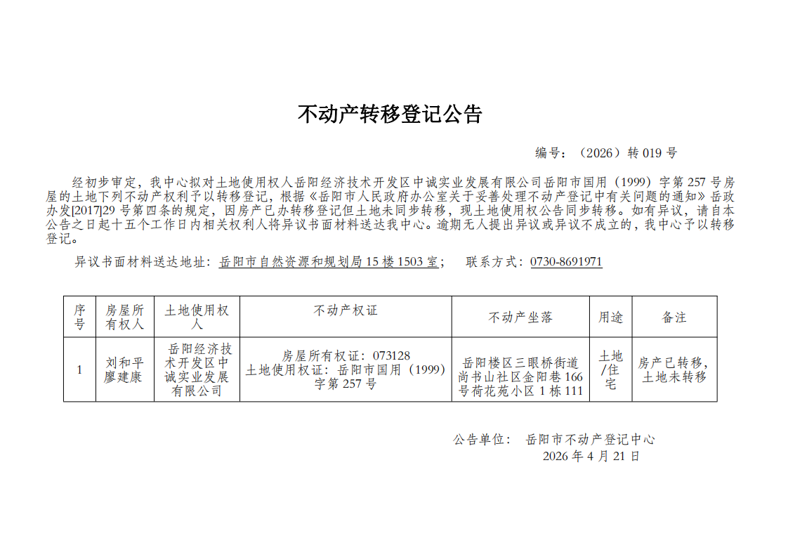 不动产转移登记公告 编号:岳阳经济技术开发区中诚实业发展有限公司(2026)转019号