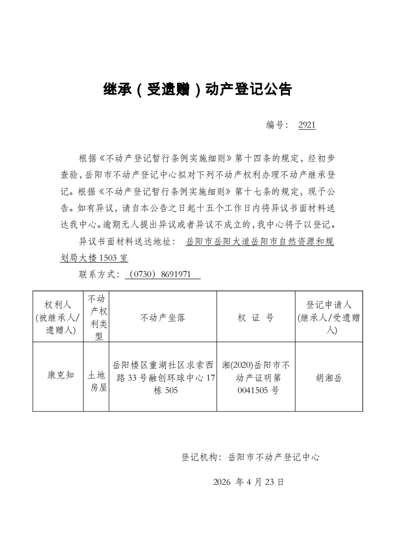 继承(受遗赠)不动产登记公告 编号:胡湘岳(2921)