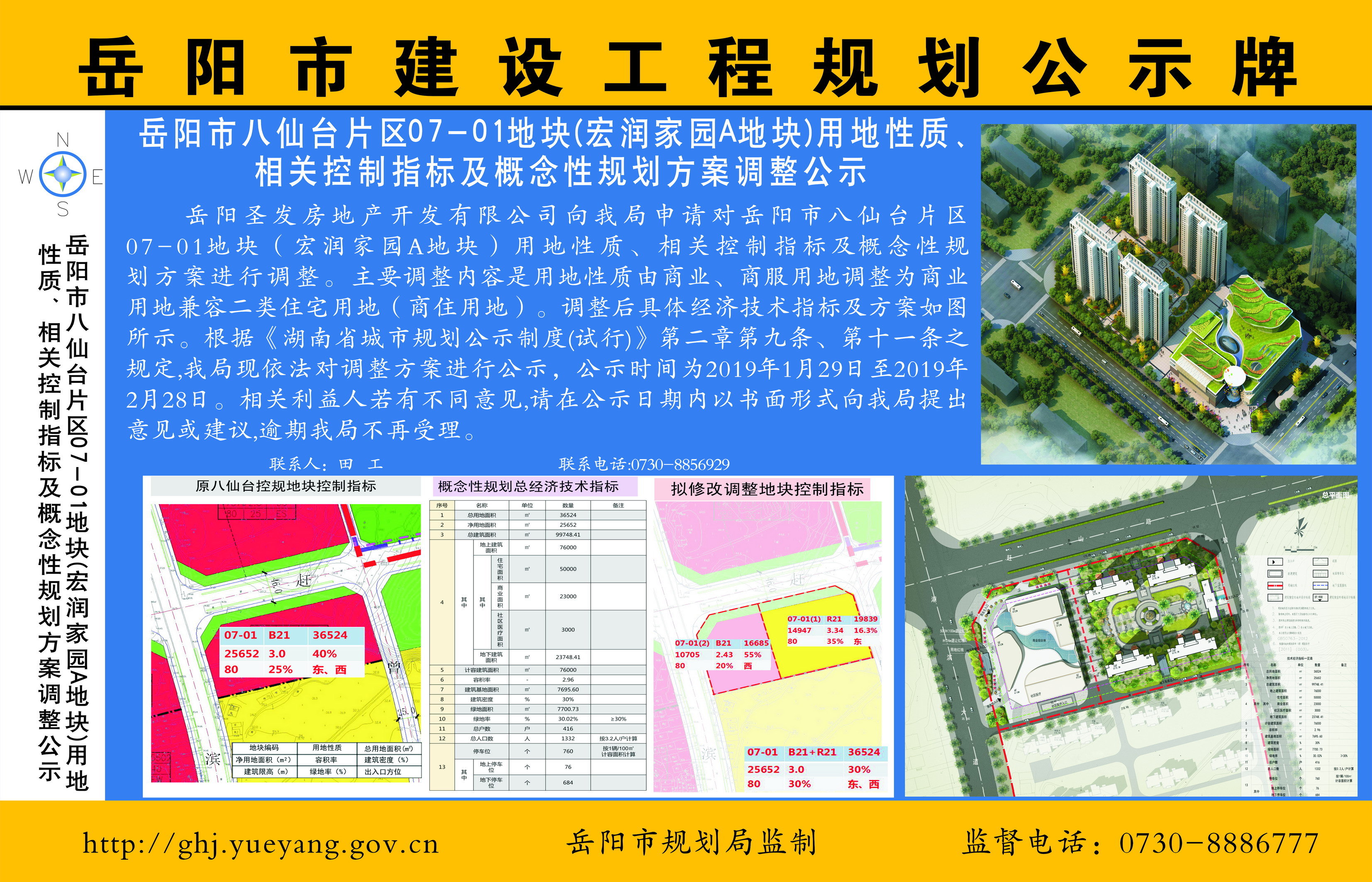 岳阳市八仙台片区07-01地块(宏润家园A地块)用地性质、相关控制指标及概念性规划方案调整公示
