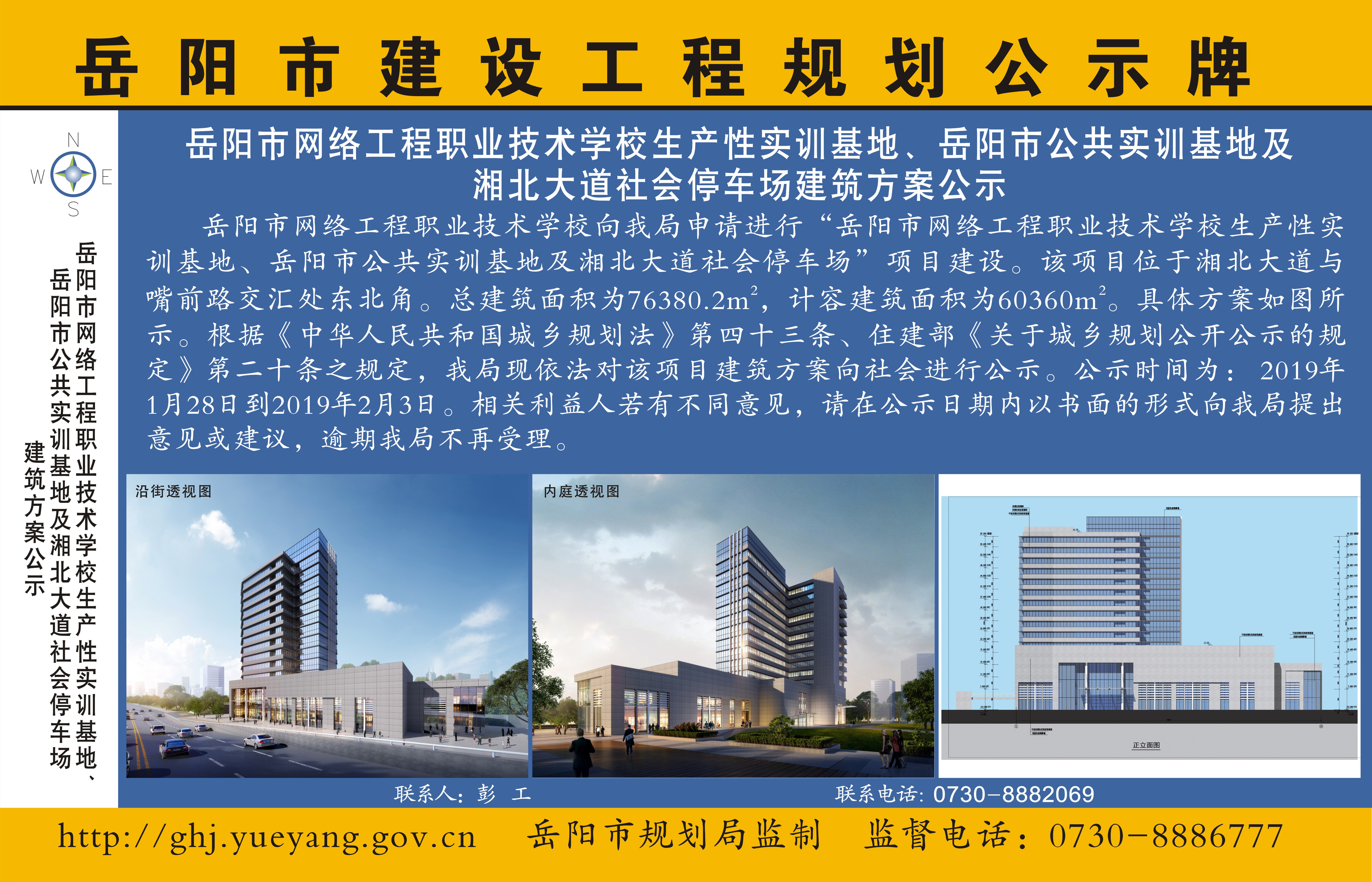 岳阳市网络工程职业技术学校生产性实训基地、岳阳市公共实训基地及湘北大道社会停车场建筑方案公示