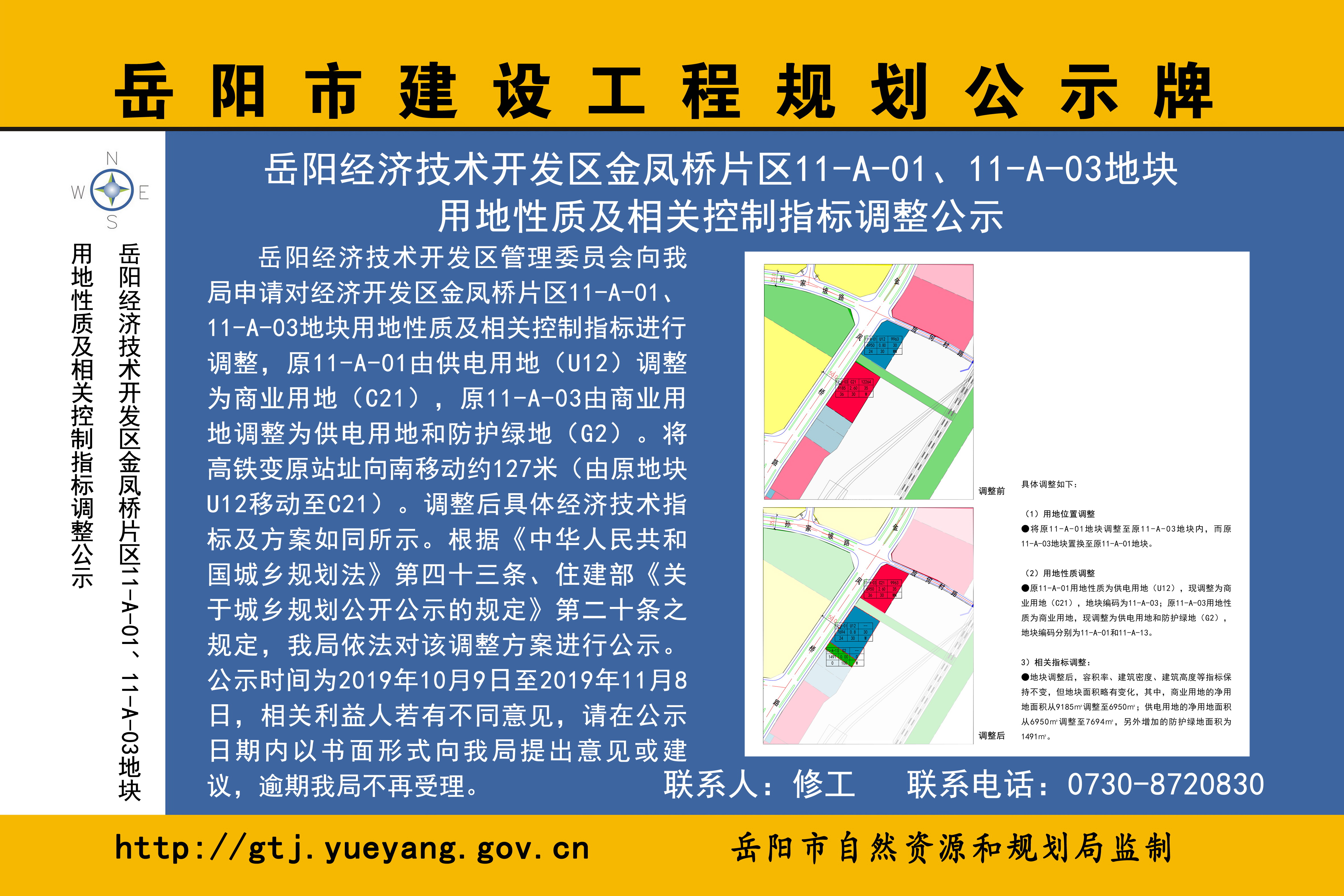 岳阳经济技术开发区金凤桥片区11-A-01、11-A-03地块用地性质及相关控制指标调整公示