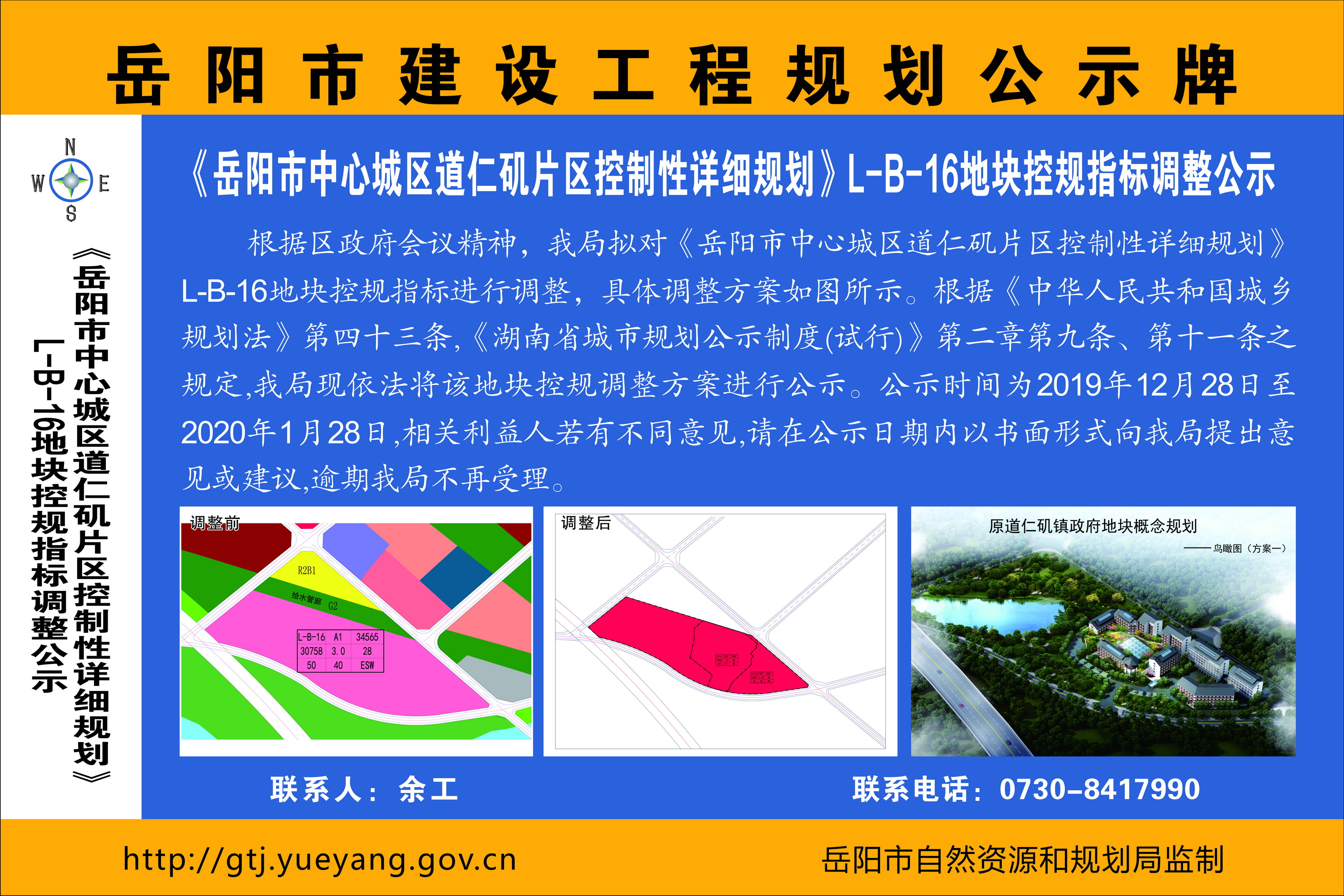 《岳阳市中心城区道仁矶片区控制性详细规划》L-B-16地块控规指标调整公示