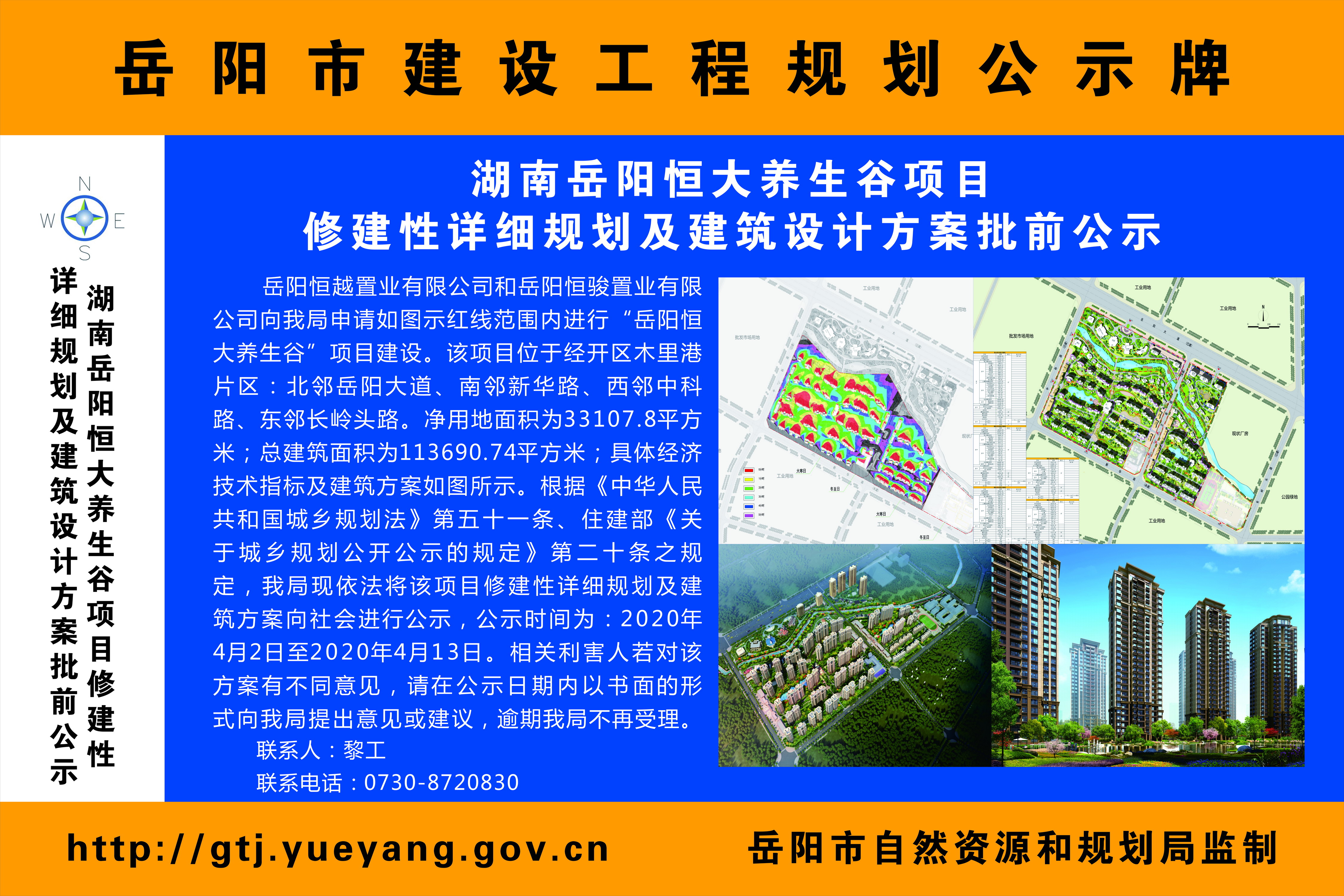 湖南岳阳恒大养生谷项目修建性详细规划及建筑设计方案批前公示