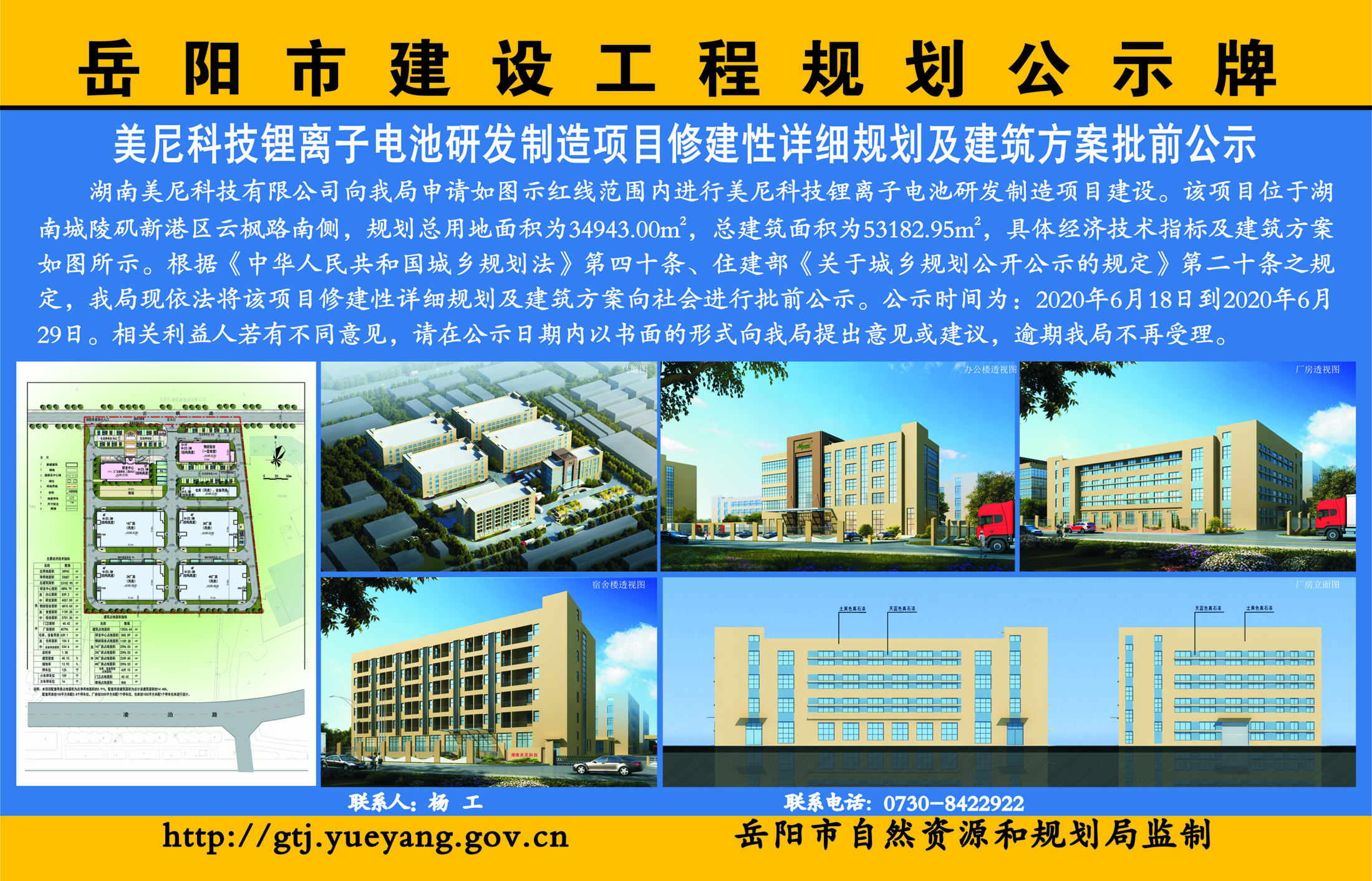 美尼科技锂离子电池研发制造项目修建性详细规划及建筑方案批前公示