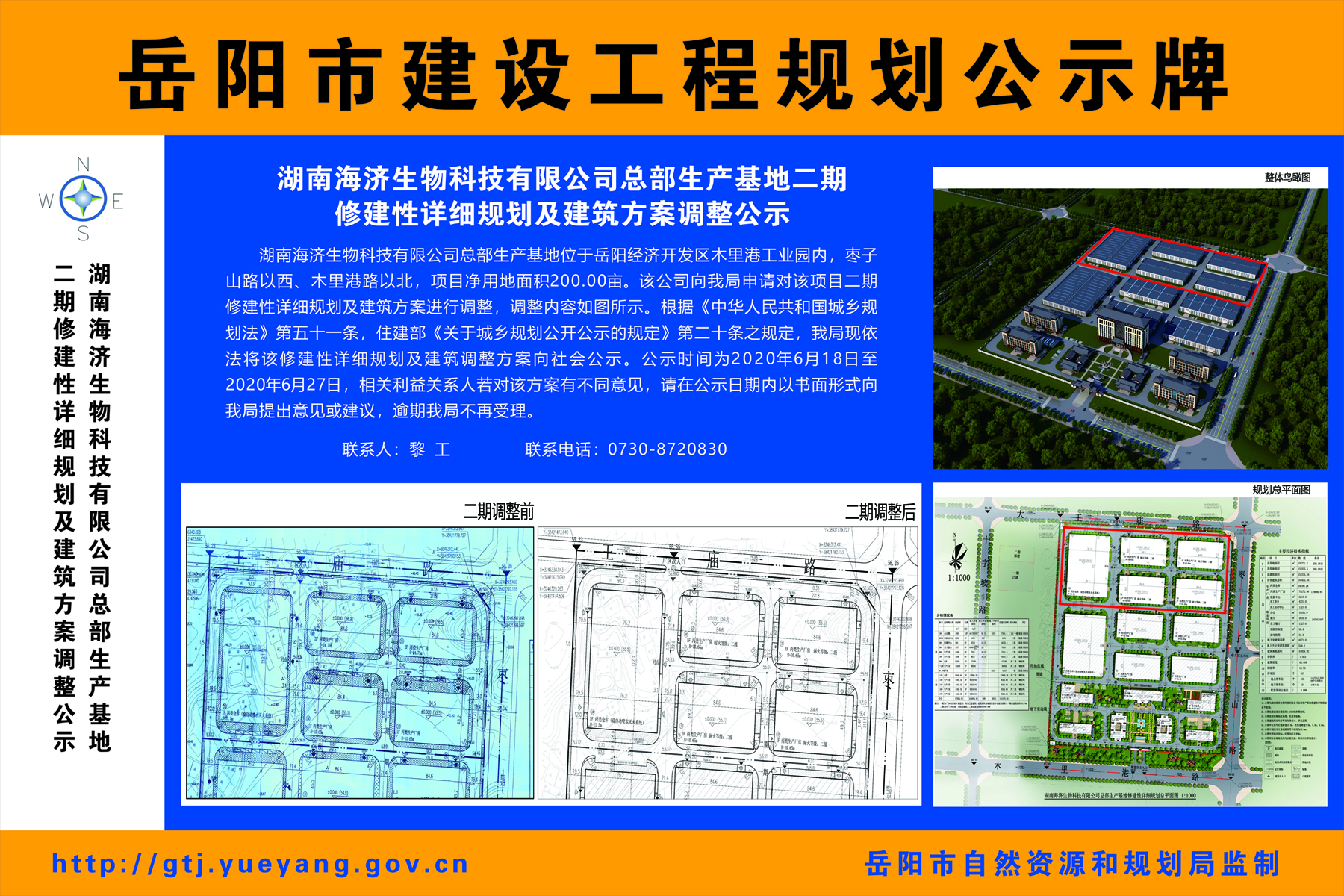 海济生物科技有限公司总部生产基地二期修建性详细规划及建筑方案调整公示牌