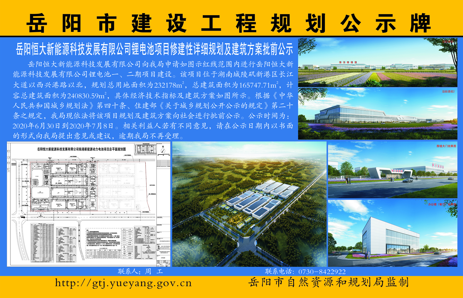 岳阳恒大新能源科技发展有限公司锂电池项目修建性详细规划及建筑方案批前公示