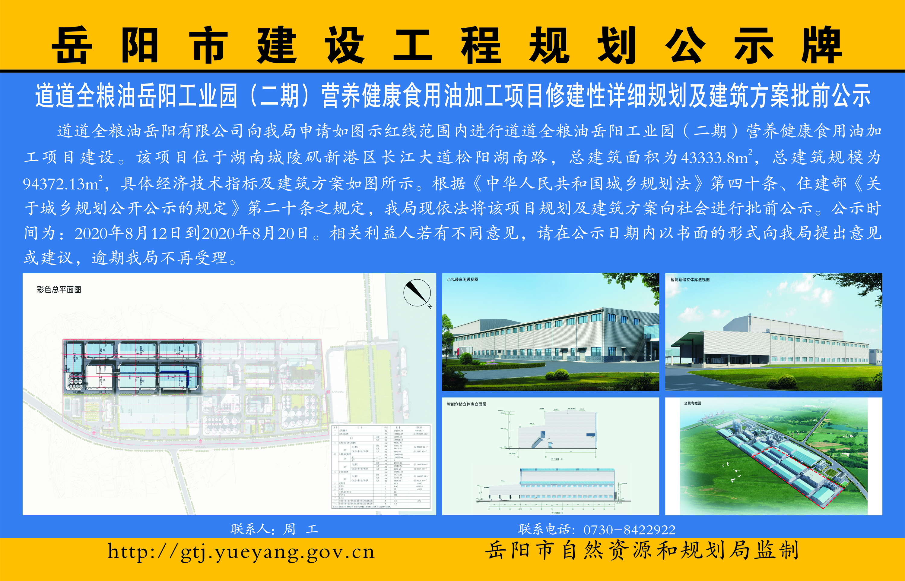 道道全粮油岳阳工业园(二期)营养健康食用油加工项目修建性详细规划及建筑方案批前公示