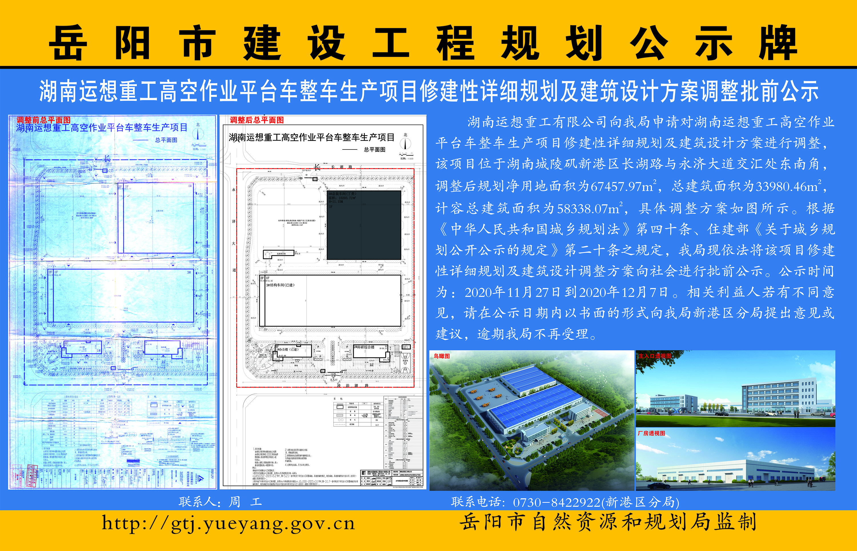 湖南运想重工高空作业平台车整车生产项目修建性详细规划及建筑设计方案调整批前公示