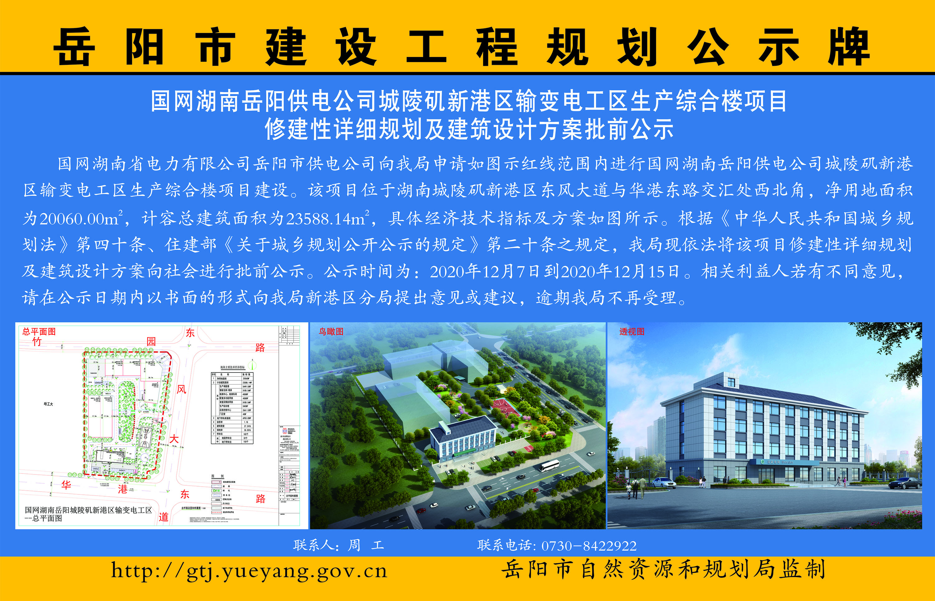 国网湖南岳阳供电公司城陵矶新港区输变电工区生产综合楼项目修建性详细规划及建筑设计方案批前公示