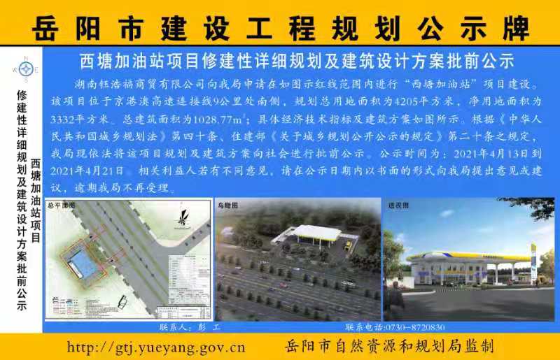 湖南钰浩福商贸有限公司“西塘加油站”项目修建性详细规划及建筑设计方案批前公示