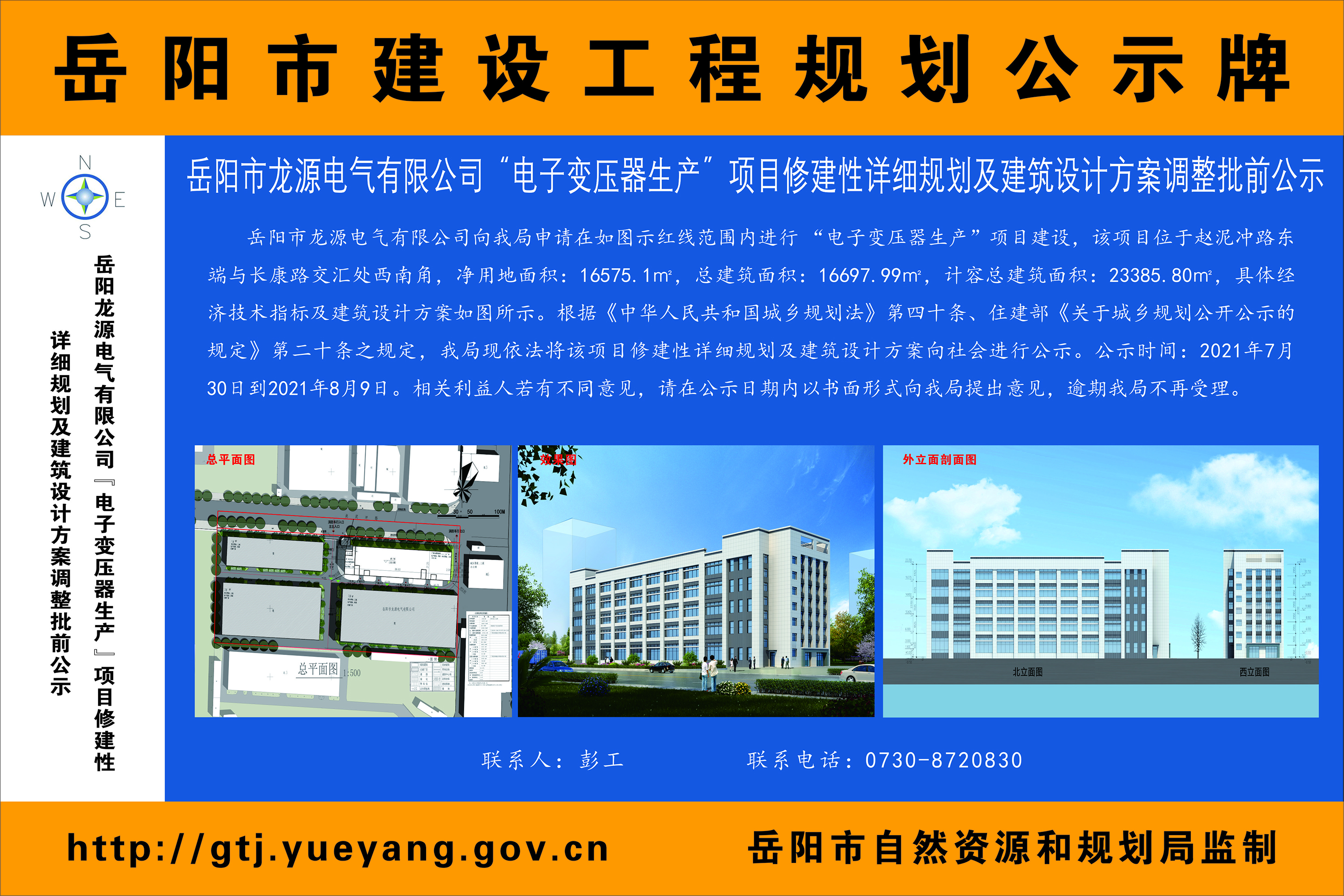 岳阳市龙源电气有限公司“电子变压器生产”项目修建性详细规划及建筑设计方案调整批前公示