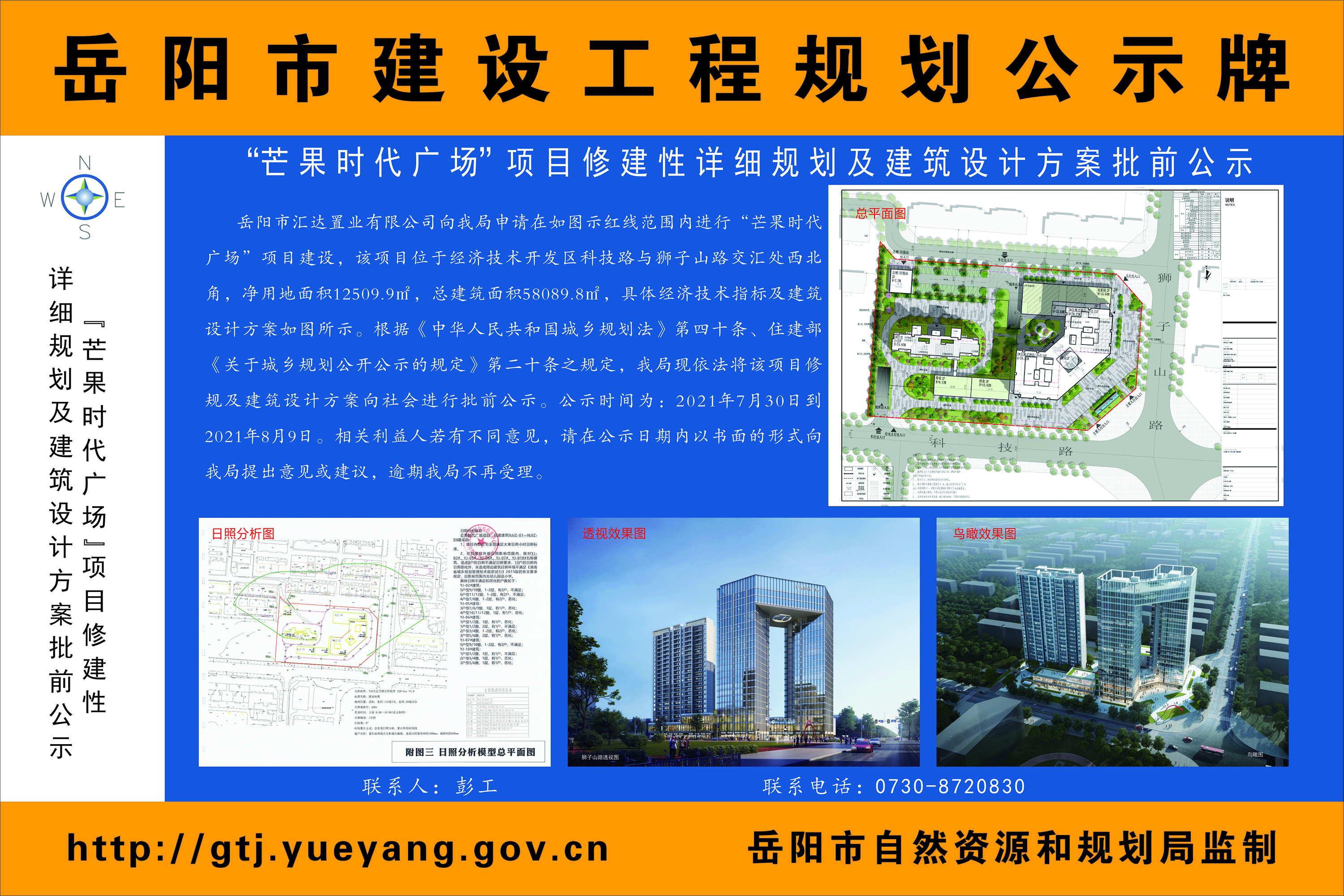 岳阳市汇达置业有限公司“芒果时代广场”项目修建性详细规划及建筑设计方案批前公示